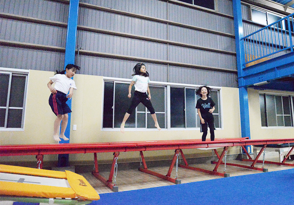 倉庫をリノベーションした空間に高鉄棒やトランポリンといった運動器具を設置し、器械体操を気軽に楽しみたい方から本格的に学びたい方まで幅広く教えています。小学校に通う前の小さなお子様から、小・中学生、大人の方まで、それぞれに適したメニューでレッスンを行っています。器械体操は、体幹を強くし、柔軟で丈夫な体をつくるのにとても適しています。日常生活ではなかなかできないアクロバティックな動きにより、平衡感覚や自律神経を鍛えることもできるので、ぜひ一度体験しにお越しください。